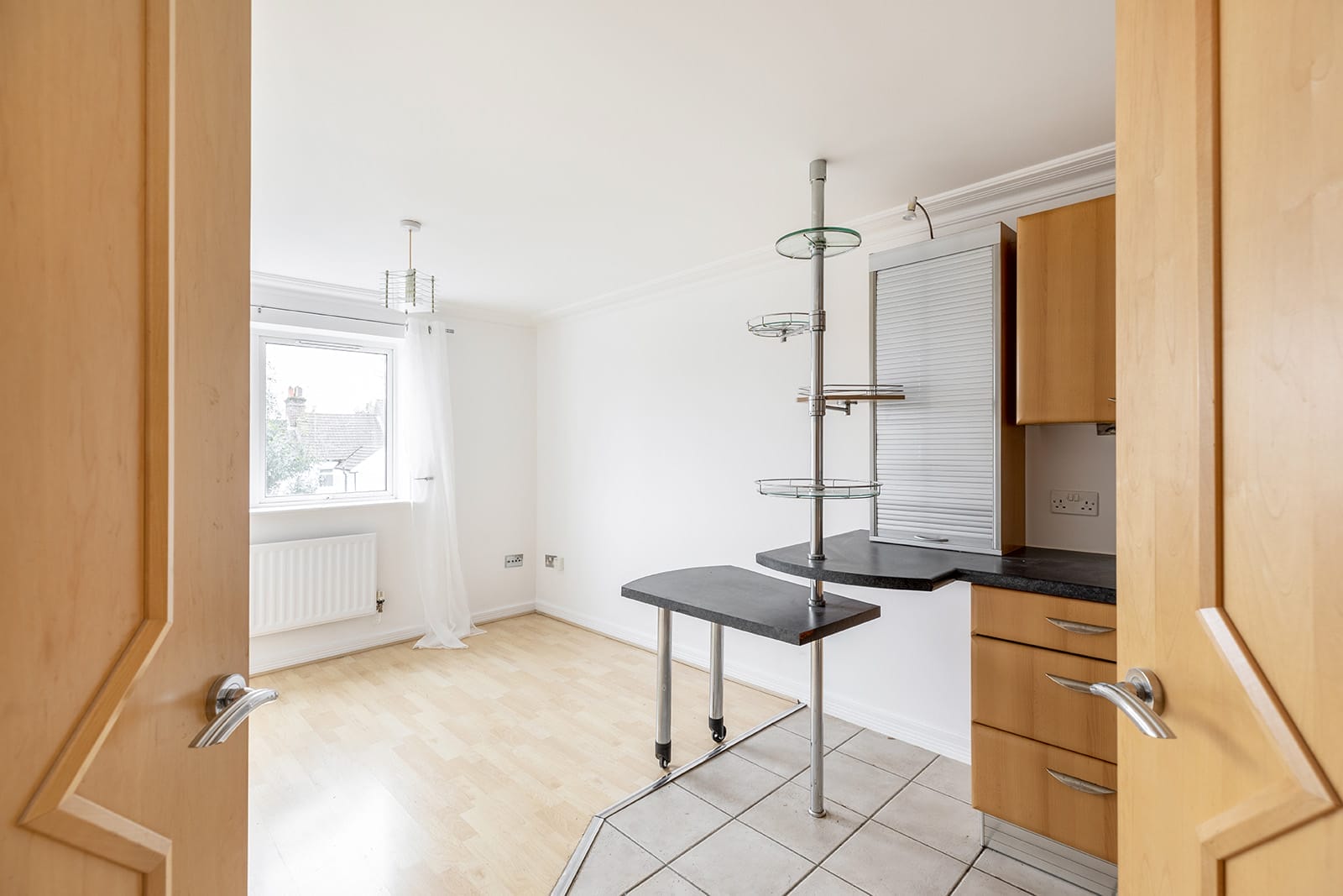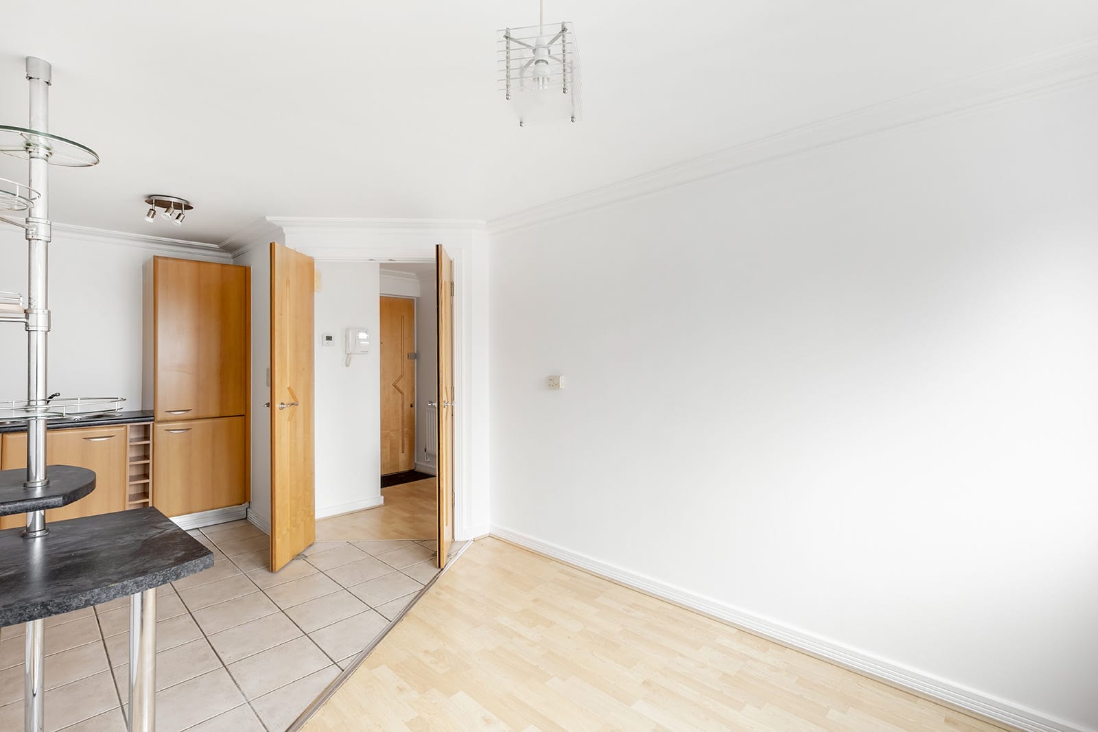 Inside, the entrance hall leads to a light-filled, open-plan kitchen and living space, fitted with contemporary cabinetry to one end and designed for everyday ease. A double bedroom with built-in wardrobe sits across the hallway, alongside a well-proportioned bathroom.